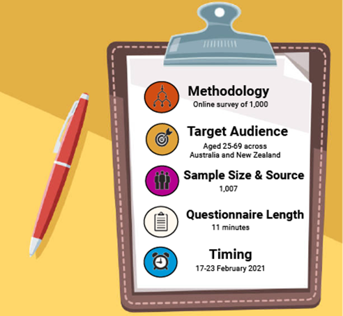 The survey was conducted online and consisted of 1,007 participants, aged between 25-69, across regional and metropolitan Australia and New Zealand. Out of the 1,007 participants, 518 of them are male, while 489 are female. Consequently, the target audience for this survey came from different employment categories, with the majority of the participants belonging to the professional services category (49.2%) and the least number of participants, which are composed of students (2.8%). The income of participants ranges from $34,999 and below to $130,000 and over, with 5.90% preferring not to mention.