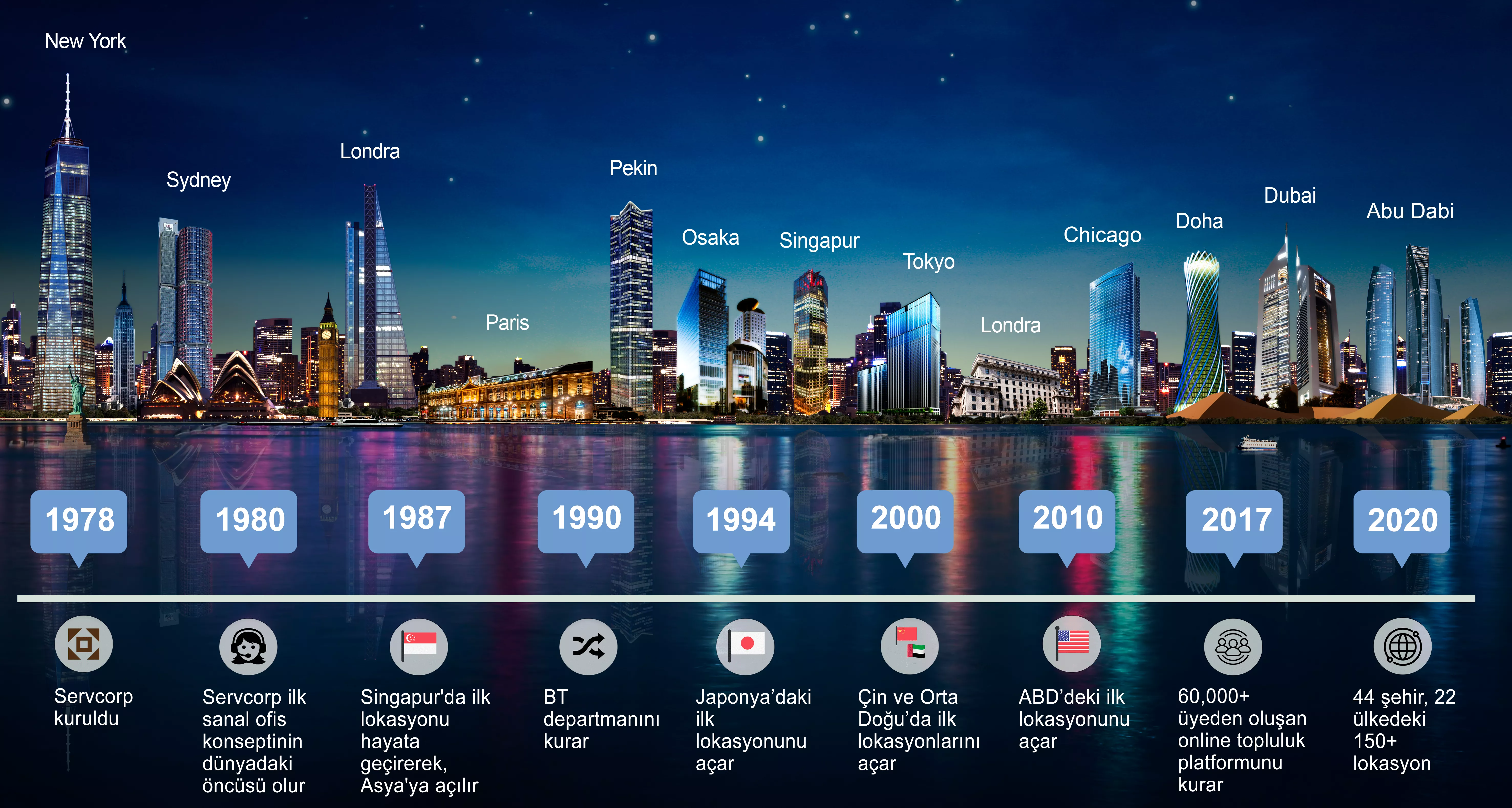 | İş Özeti | Dünyanın en prestijli Hazır Ofislerini, Sanal Ofislerini, Ortak Çalışma Alanlarını ve Toplantı Odalarını sunan Servcorp; 19 ülkede, 40 şehirde ve 150’den fazla lokasyonda faaliyet göstermektedir. Bu prestijli adresler arasında; New York’taki One World Trade Center’ın 85. katı, Tokyo’daki Marunouchi Trust Tower’ın 20. katı, Marunouchi Nijubashi Binası’nın 2. ve 3. katı, Osaka’daki Hilton Plaza West Office Tower’ın 18. ve 19. katları, Londra’daki The Leaden Hall Building’in 30. katı, Abu Dhabi’deki International Finance Centre 2 ve Etihad Towers’ın 36. katı, Singapur’daki Marina Bay Financial Centre’ın 39. katı ve daha birçok ikonik lokasyon bulunmaktadır. |